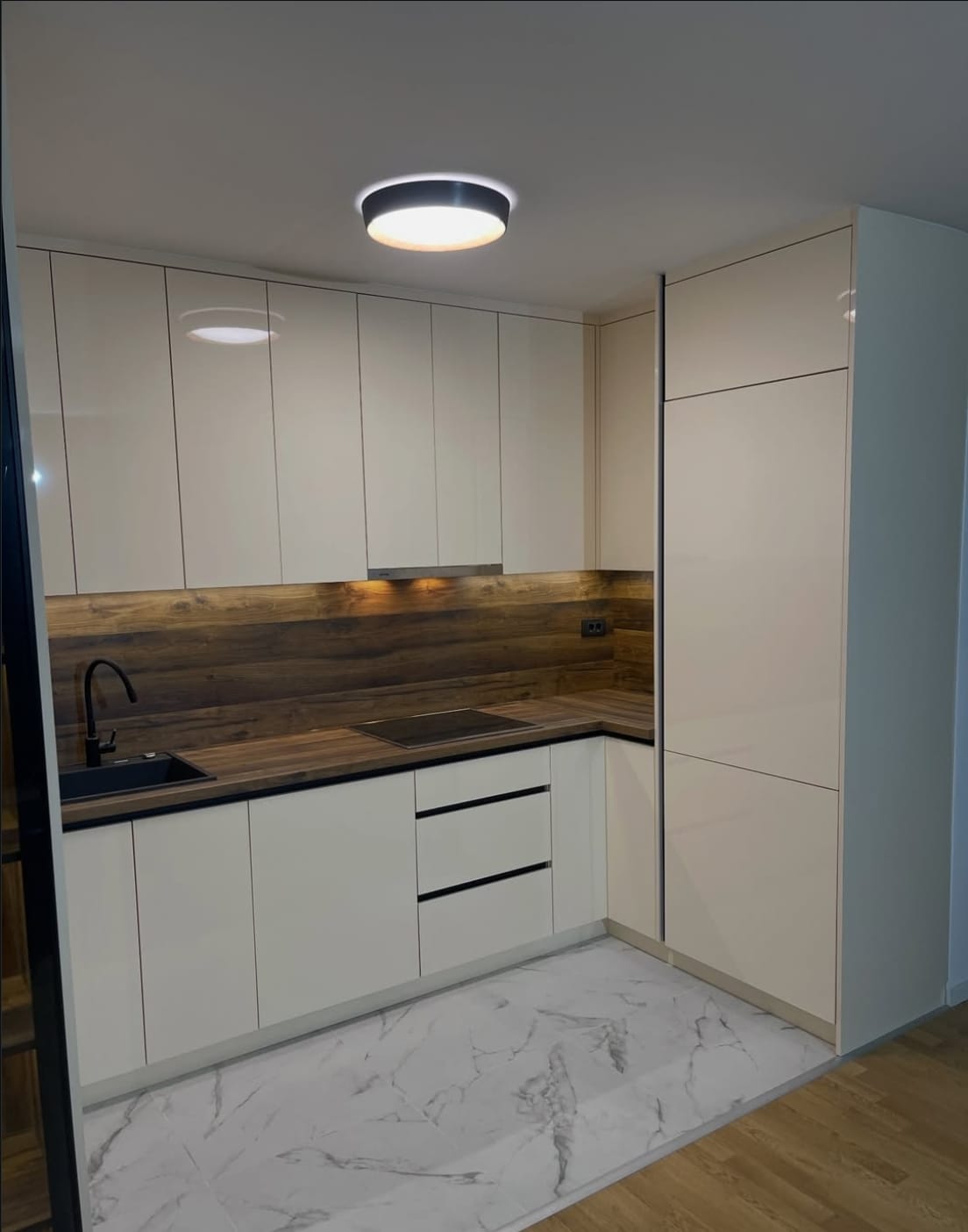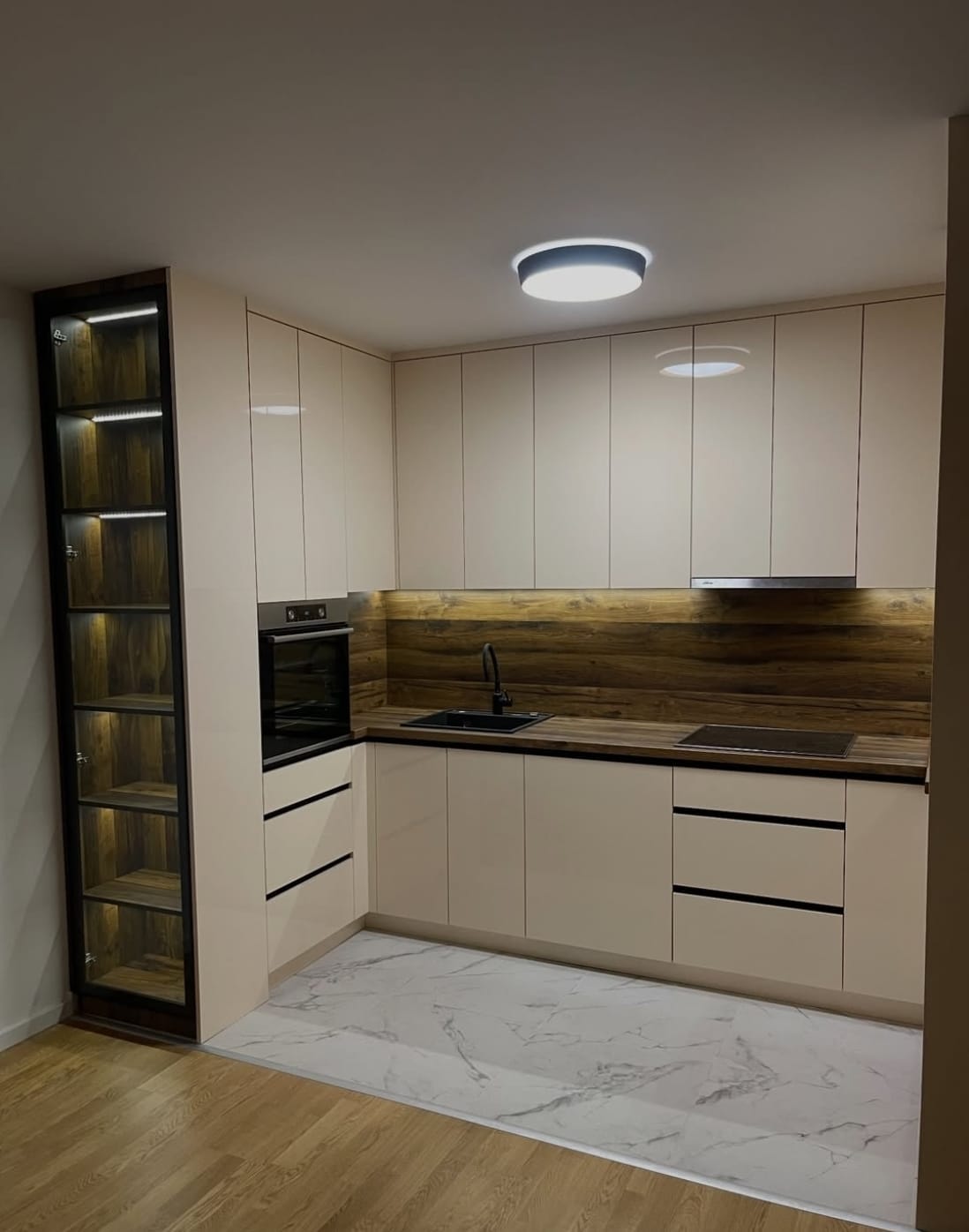 სამზარეულო მაქსიმალურად ოპტიმიზებული სივრცით არის დაგეგმილი, რაც უზრუნველყოფს როგორც კომფორტულ გამოყენებას, ასევე ფუნქციურობას ყოველდღიურ ცხოვრებაში. ვიტრინა LED განათებით ქმნის დახვეწილ ვიზუალურ აქცენტს და სივრცეს დამატებით სიღრმეს აძლევს. გამოყენებულია მაღალი ხარისხის Blum მექანიზმები, რომლებიც გამოირჩევა გამძლეობით, რბილი და უხმო დახურვის სისტემით.