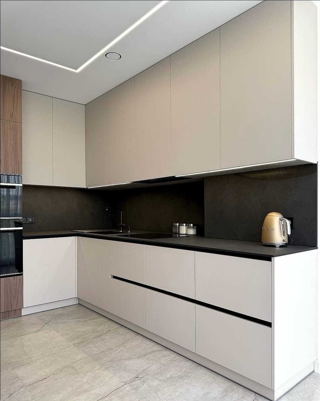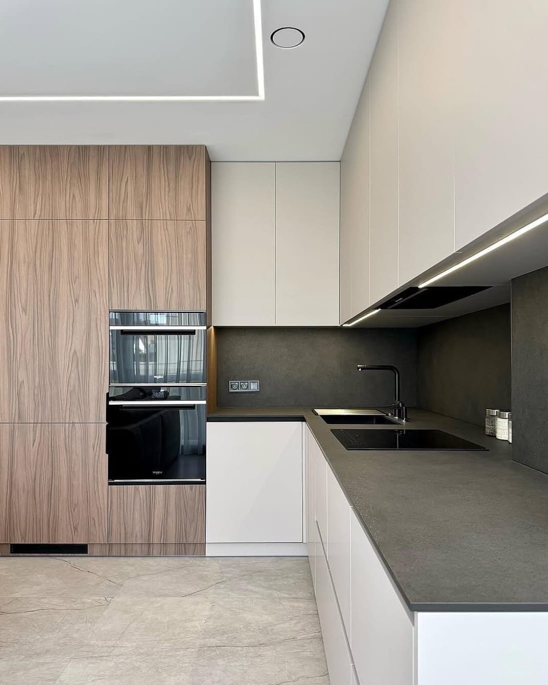Lსამზარეულო დაპროექტებულია ფუნქციურობისა და ვიზუალური ბალანსის პრინციპით.
