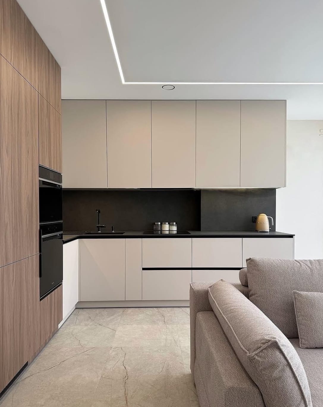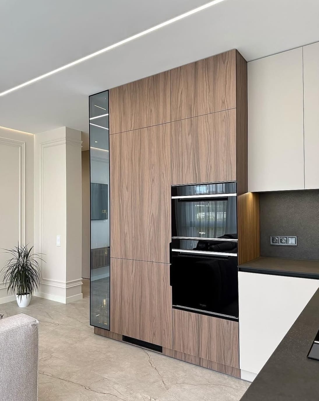 ერთ კედელზე მთლიანად გამოყენებულია დაშპონილი MDF, სადაც ჩაშენებულია მაცივარი, მიკროტალღური და ღუმელი, რაც ინტერიერს ერთიან და სუფთა იერს აძლევს. მეორე კედელზე შესრულებულია შეღებილი MDF-ის კარადები, რაც დიზაინს ამსუბუქებს და თანამედროვე სტილს უსვამს ხაზს.