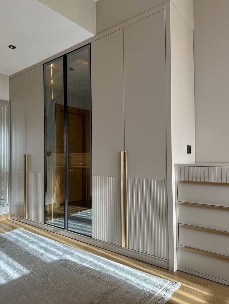 ეს პროექტი წარმოადგენს საძინებლის სრულ კომპლექტს, რომელიც შესრულებულია შეღებილი და დაფრეზილი mdf-ის მაღალი ხარისხის მასალებით. კარადის დიზაინი გაფორმებულია ვიტრაჟული ელემენტით, რაც ინტერიერს ანიჭებს გამორჩეულ და ელეგანტურ ხასიათს.