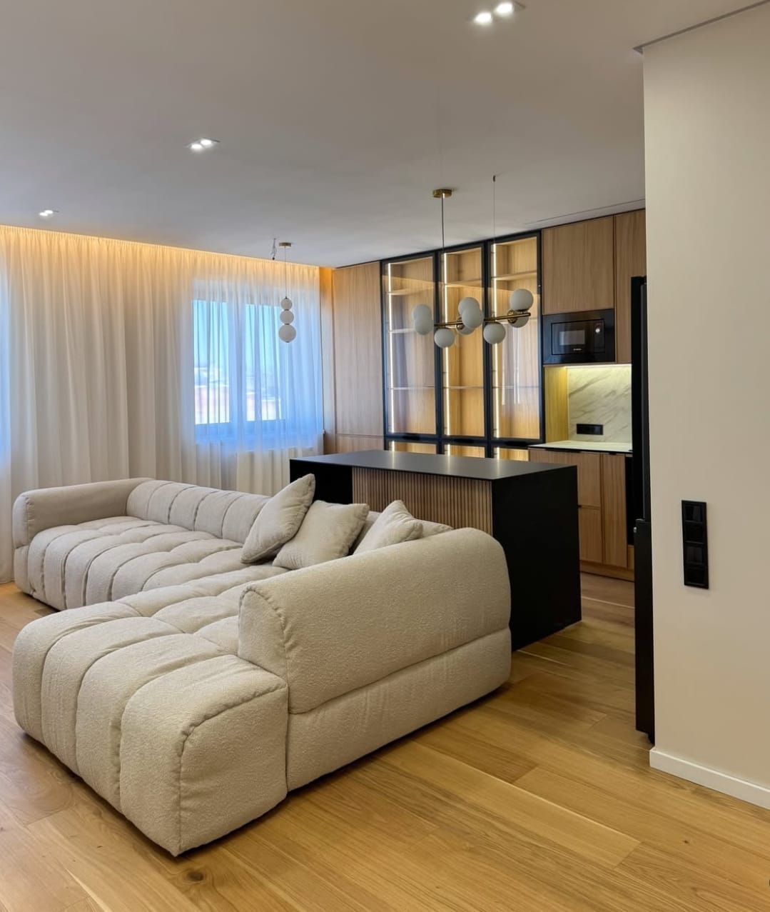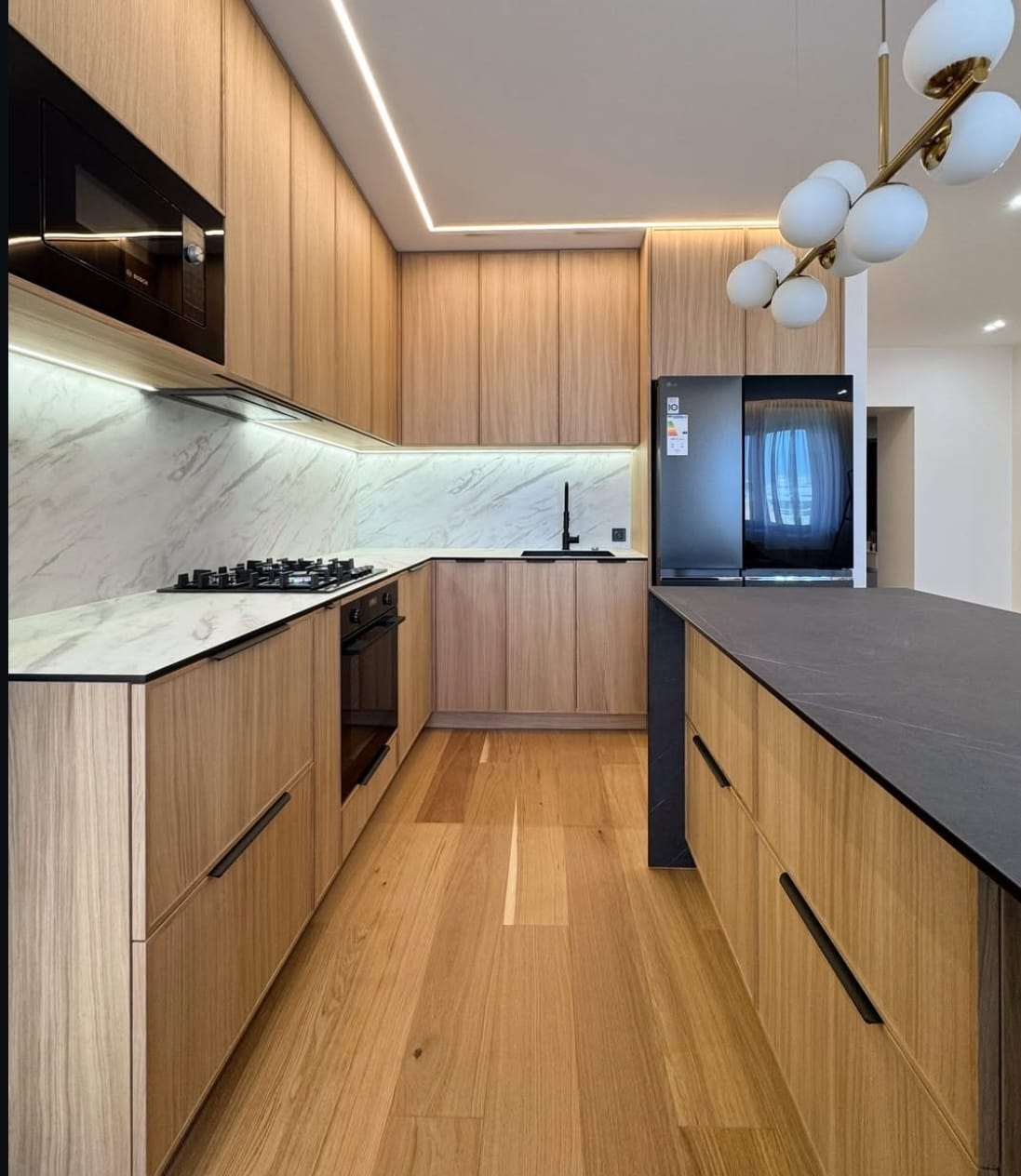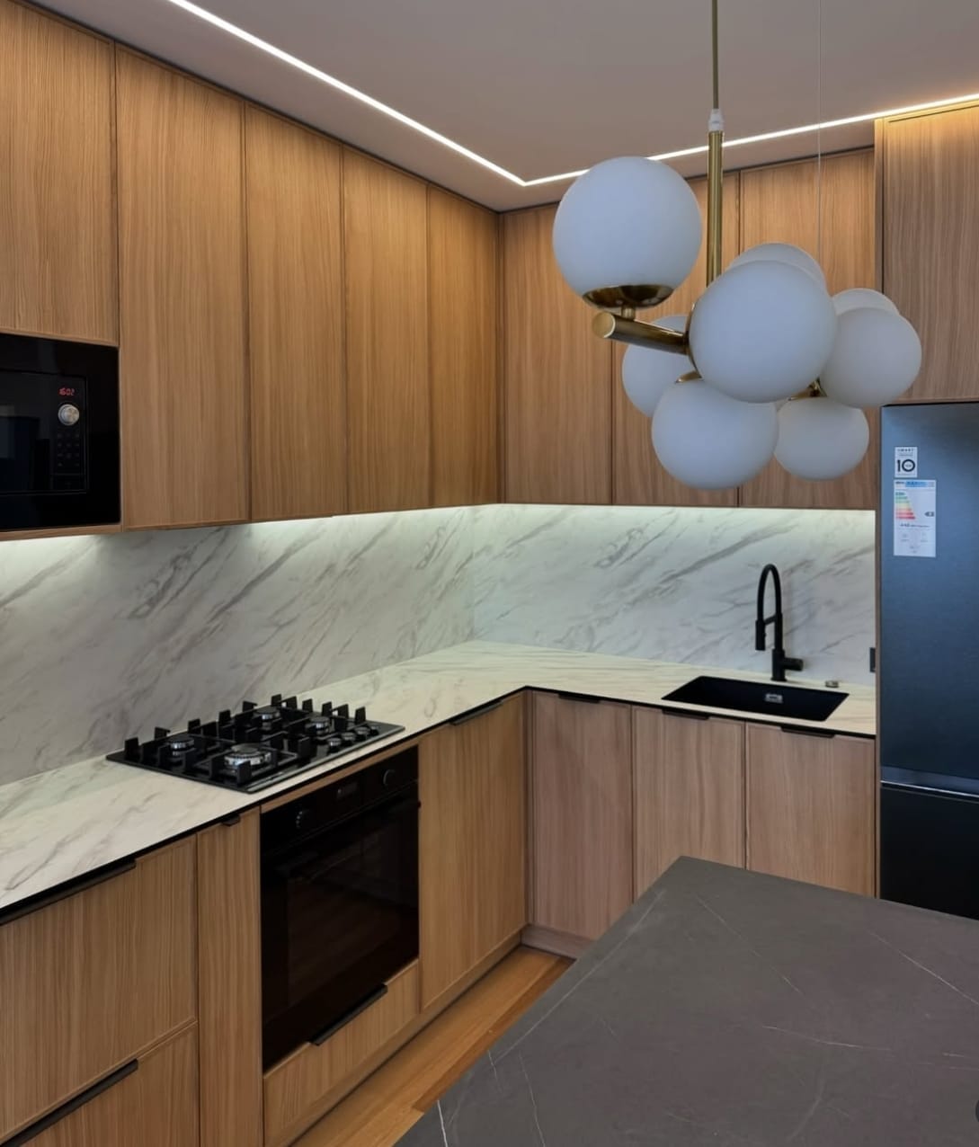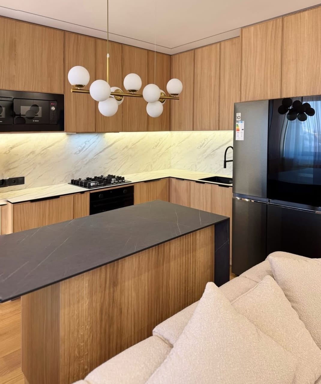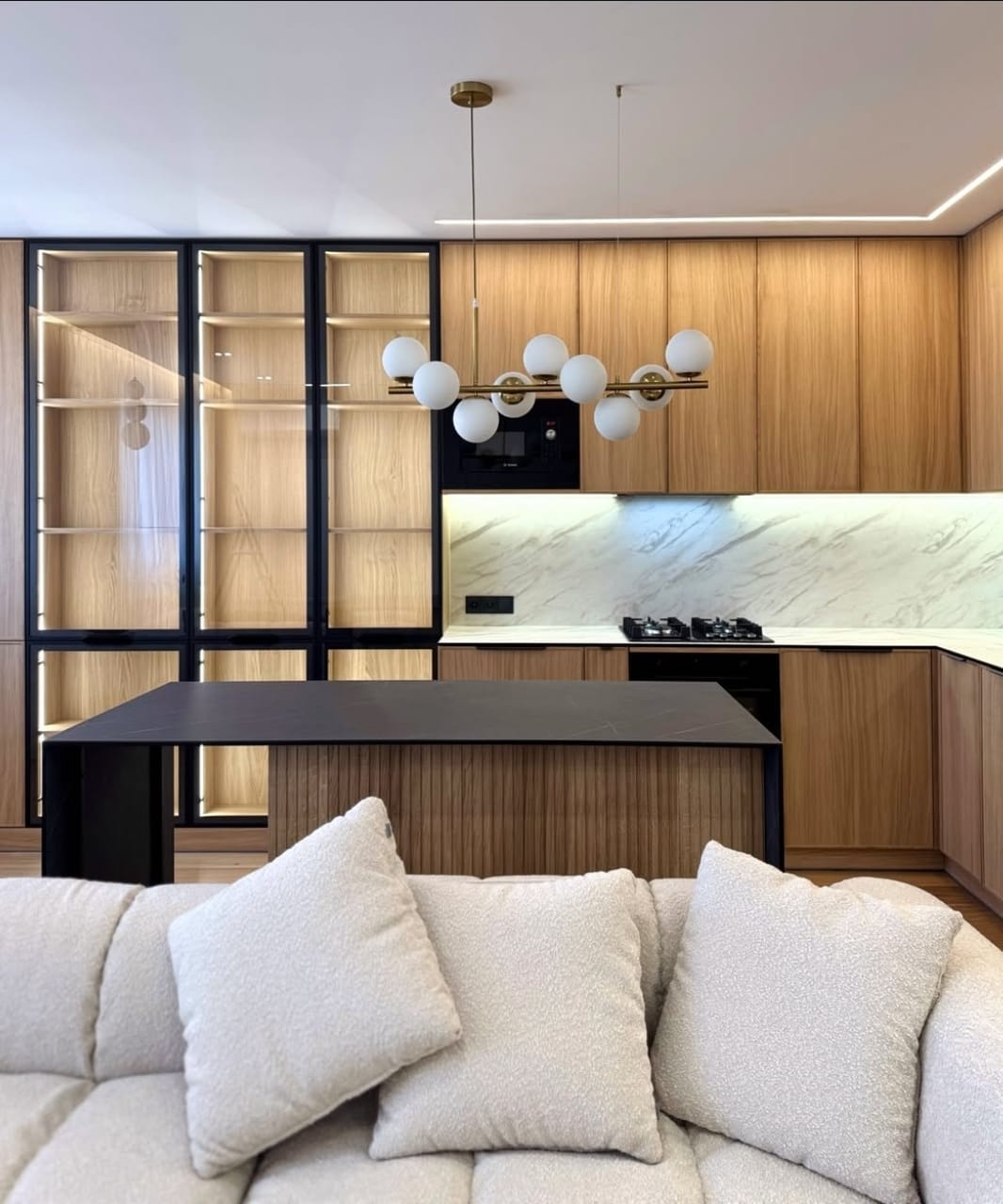 სამზარეულო იდეალურად ერწყმის მისაღებ სივრცეს და ქმნის ჰარმონიულ, ელეგანტურ ინტერიერს.