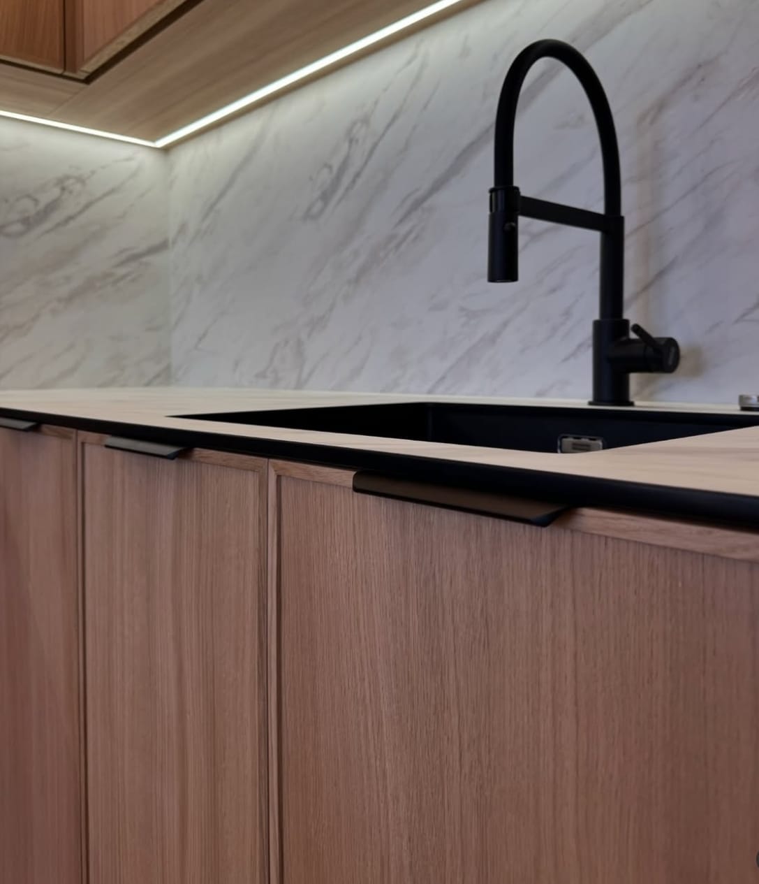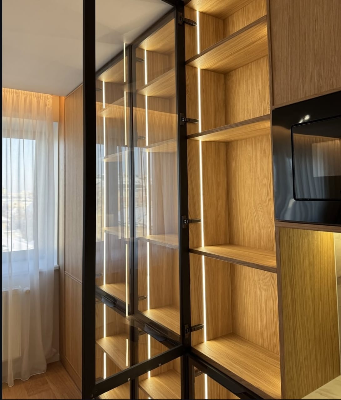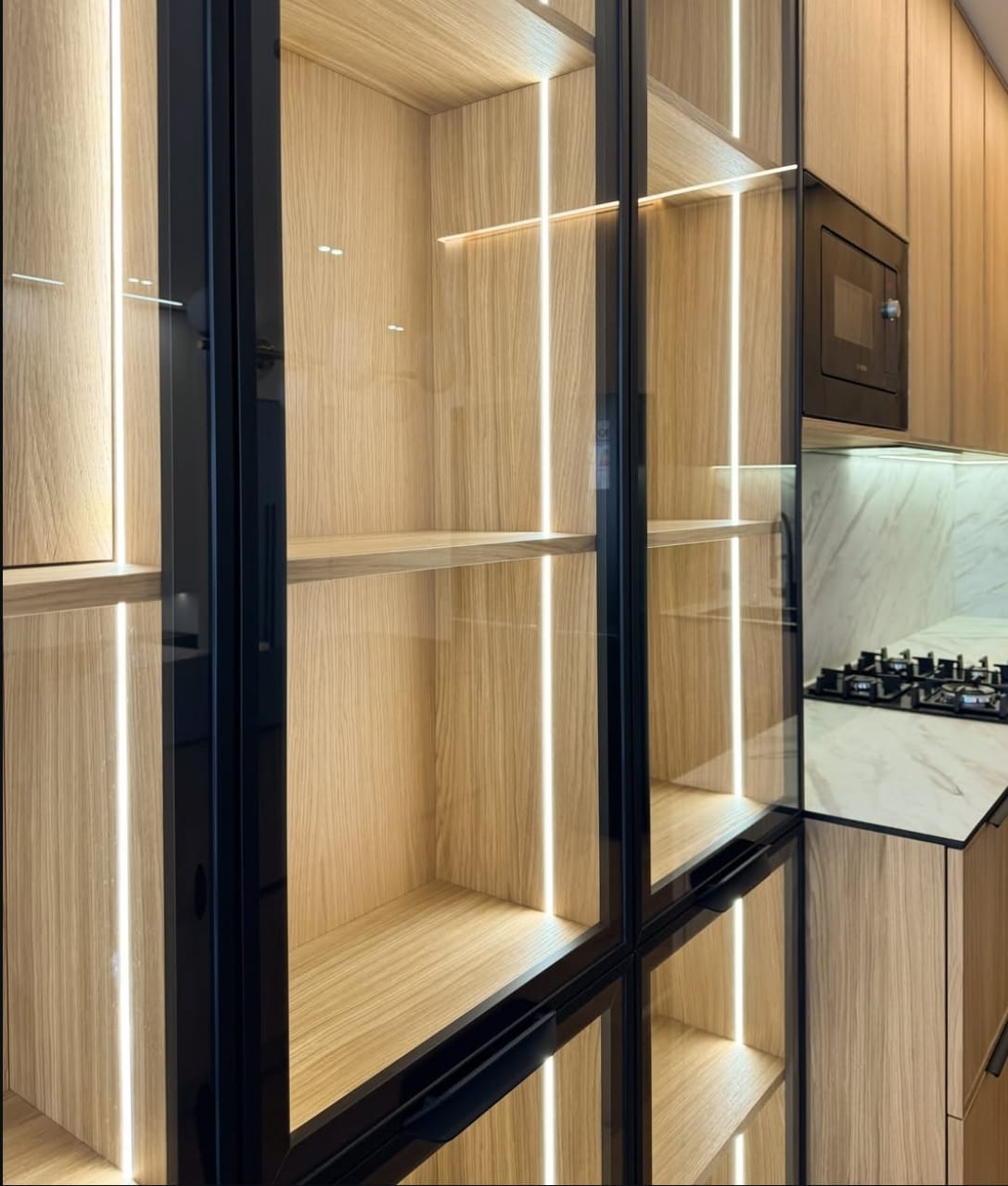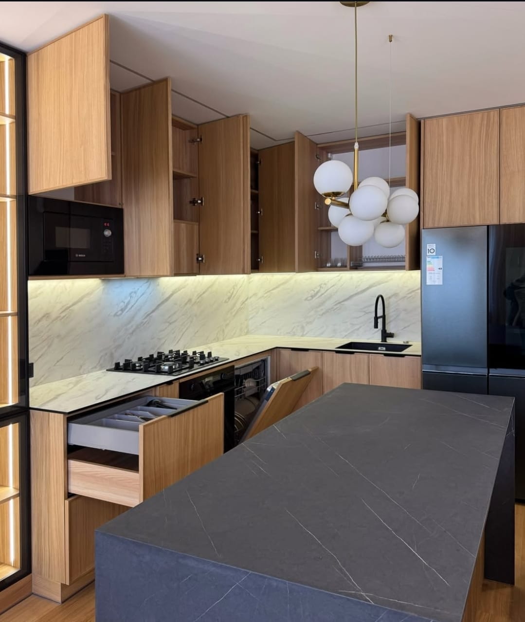 პროექტში გამოყენებულია მხოლოდ პრემიუმ მასალები. ფასადი დაშპონილი მდფ. კარკასი ავსტრიული ლამინატი, ავსტრიული ბლუმის მექანიზმები და გამძლე HPL წყალგამძლე ზედაპირი. ალუმინის ვიტრინა ინტეგრირებული განათებით და ფუნქციური კუნძული უზრუნველყოფს მაქსიმალურ კომფორტს ყოველდღიურ გამოყენებაში.