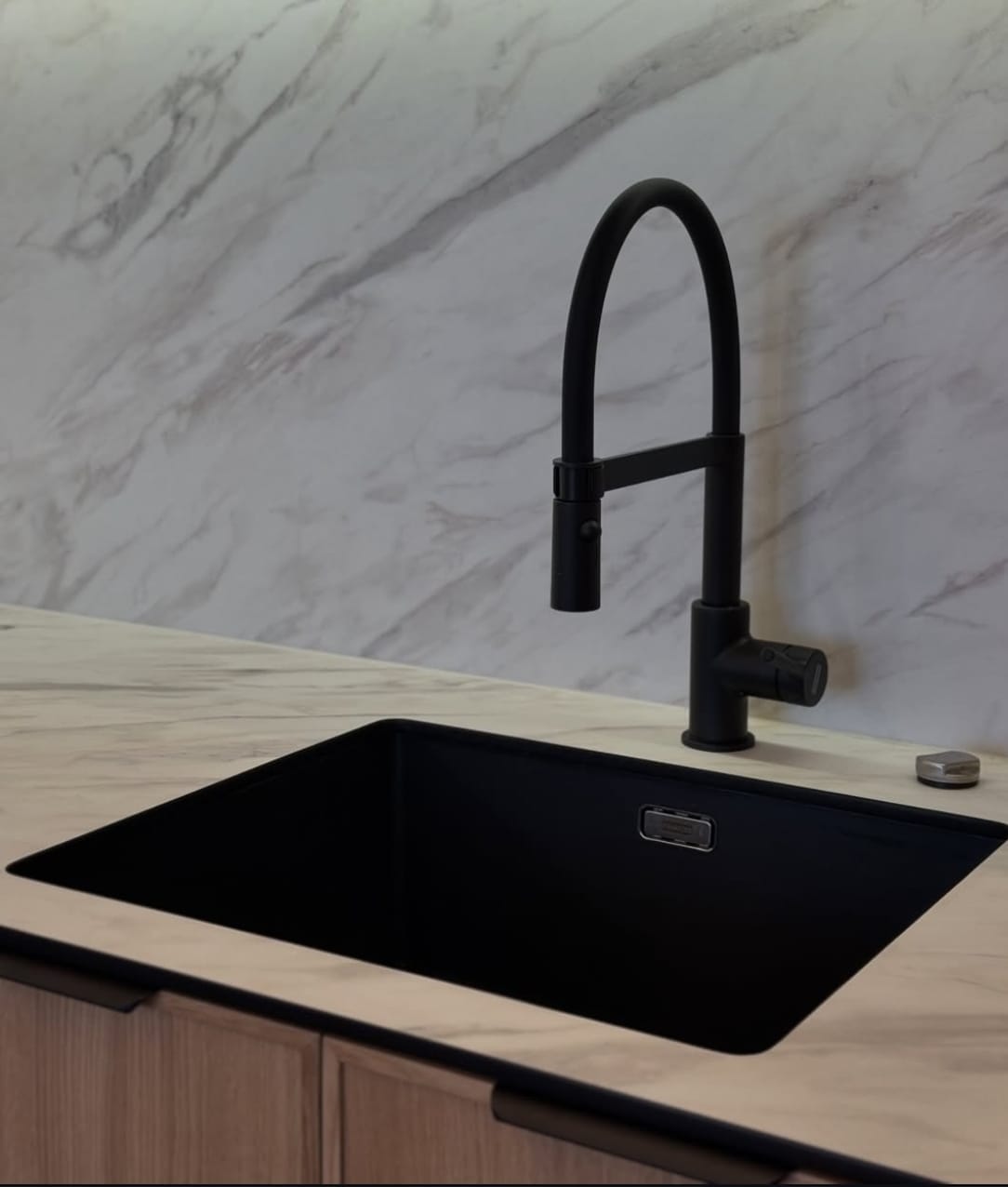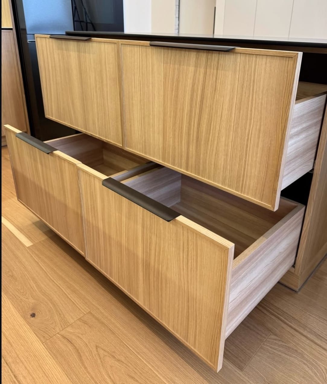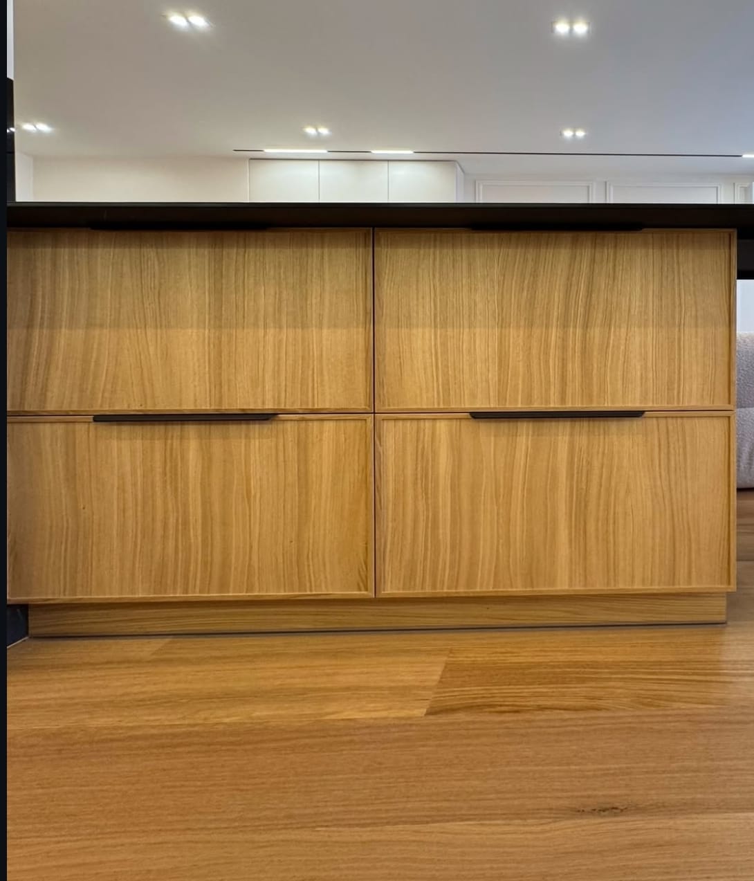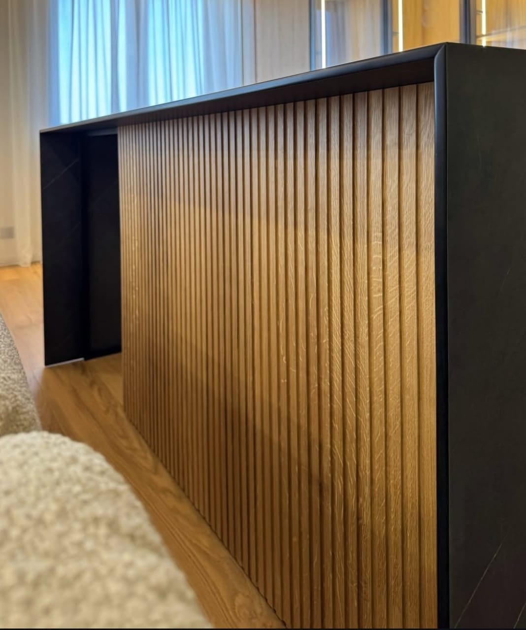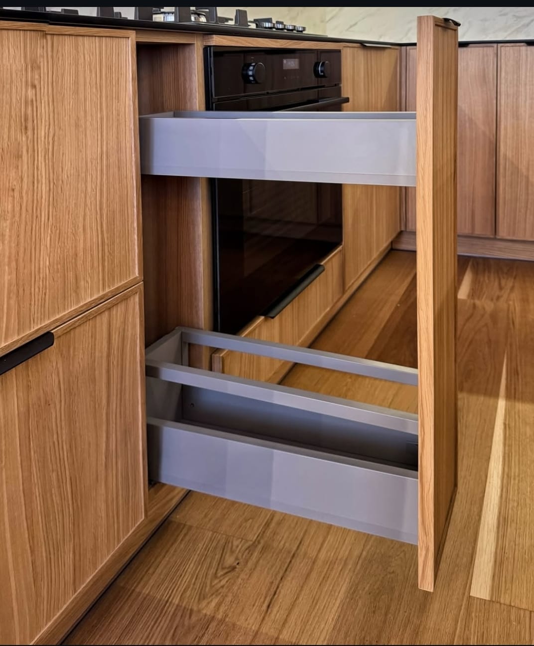 პროექტში გამოყენებულია მხოლოდ პრემიუმ მასალები. ფასადი დაშპონილი მდფ. კარკასი ავსტრიული ლამინატი, ავსტრიული ბლუმის მექანიზმები და გამძლე HPL წყალგამძლე ზედაპირი. ალუმინის ვიტრინა ინტეგრირებული განათებით და ფუნქციური კუნძული უზრუნველყოფს მაქსიმალურ კომფორტს ყოველდღიურ გამოყენებაში.